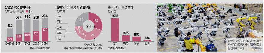 반면 중국은 이미 자국 내 로봇 제조 생태계를 대규모로 확장하며 세계 시장 점유율을 빠르게 끌어올리고 있다. ‘세계의 공장’으로서 확보한 방대한 제조 기반과 정부 주도의 집중 투자 덕분에 중국은 값싼 산업용 로봇 수급을 무기로 글로벌 영향력을 강화하고 있다. 미국·유럽 기업들이 고난도 기술을 선도한다면, 중국은 대량 생산과 가격 경쟁력을 기반으로 시장을 잠식하는 양상이 더욱 뚜렷해지고 있다.