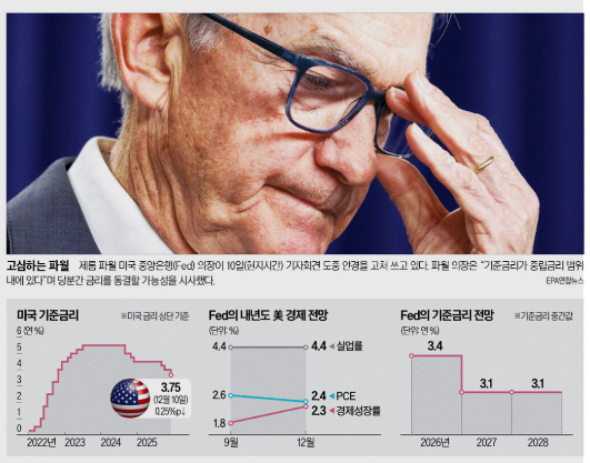 연준 위원들의 금리 전망을 보여주는 점도표에서는 내년 금리 인하 폭이 매우 제한적인 것으로 나타났다. 일부 위원들은 금리 동결을 주장했고, 일부는 더 큰 폭의 인하를 주장하는 등 의견이 양분된 점도 특징이다. 이는 연준 내부에서도 경제의 불확실성을 어떻게 해석할지 명확한 합의가 없다는 의미다. 결국 중앙값 기준으로는 내년 금리를 단 한 번 내리는 정도의 최소 조정이 가장 현실적인 시나리오로 제시됐다. 이는 경제가 더 나빠지지 않는 이상, 연준이 적극적인 완화 정책으로 되돌아갈 생각이 거의 없다는 뜻이기도 하다.