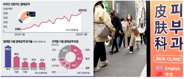 올해 외국인 소비가 20조원을 넘어섰다는 분석이 나온다. 관광객 수 회복을 넘어, 소비의 ‘질’이 달라졌다는 점이 더 눈길을 끈다. 면세점과 명품 매장 중심의 쇼핑에서 벗어나, 약국과 피부과 같은 생활·의료 영역으로 지출이 빠르게 이동하고 있기 때문이다. 이는 단기 특수가 아닌 구조적 변화의 신호로 읽힌다.