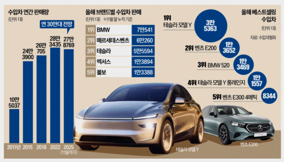 국내 수입차 시장이 연간 30만대 시대에 진입했다. 불과 몇 년 전만 해도 수입차는 일부 고소득층의 선택지로 인식됐지만, 이제는 도로 위에서 더 이상 낯설지 않다. 이 변화의 중심에는 전기차를 앞세운 테슬라와 가격 경쟁력을 무기로 한 BYD가 있다. 이들 브랜드는 수입차 시장의 외연을 넓히며 판 자체를 키웠다.