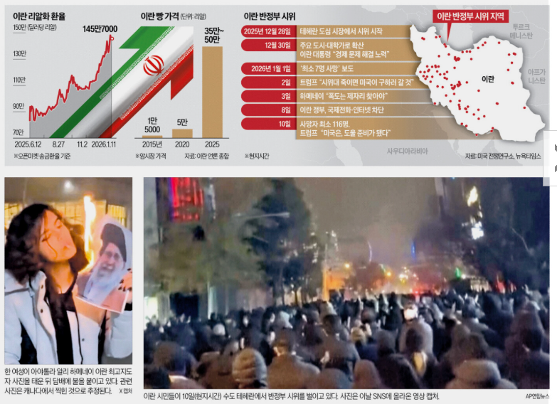 이란 전역에서 반정부 시위가 확산되며 100명 이상이 사망한 것으로 알려지자 중동의 긴장 수위가 급격히 높아지고 있다. 물가 폭등과 장기 침체, 정치적 억압이 누적되며 시민들의 분노가 거리로 분출됐고, 정부는 강경 진압으로 맞섰다. 여기에 도널드 트럼프 전 미국 대통령이 “이란의 아픈 곳을 때리겠다”는 초강경 발언을 내놓으면서, 이란의 내부 위기가 국제 정치의 뇌관으로 번질 가능성까지 거론되고 있다. 지금의 이란 사태는 단순한 시위가 아니라 중동 전체를 흔들 수 있는 구조적 위기로 발전하고 있다.