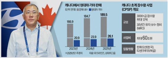 캐나다의 차세대 잠수함 도입 사업이 글로벌 방산업계의 최대 격전지로 떠오른 가운데, 한국 컨소시엄의 행보에 이목이 쏠리고 있다. 사업 규모만 약 60조원에 달하는 초대형 프로젝트다. 이 경쟁의 한복판에서 정의선 현대차그룹 회장이 전면이 아닌 ‘측면 지원’에 나서며 존재감을 드러내고 있다. 방산을 넘어 국가 산업 경쟁력 차원의 전략이라는 해석이 나온다.