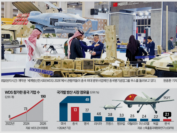 중동 방산 전시장이 중국 기업들로 가득 찼다. 최근 열린 대형 방산 박람회에 중국 방산기업 190곳이 대거 참가하며 존재감을 과시했다. 전시장 규모만 놓고 보면 한국이 참여한 면적의 두 배에 달한다. 단순한 전시 참가가 아니라, 중국이 중동을 핵심 전략 시장으로 규정하고 방산 수출을 국가 차원에서 밀어붙이고 있다는 신호다. 방산이 더 이상 군수 산업에 머무르지 않고 외교·자원·지정학을 아우르는 전략 산업으로 진화하고 있음을 보여준다.